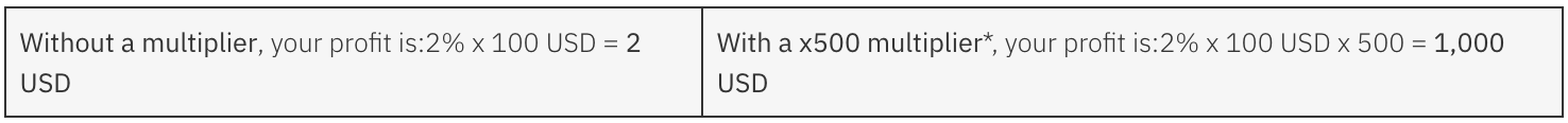 Multipliers allow you to amplify your potential profits in a similar way as leveraged trading. You simply apply a multiplier to your trades to potentially multiply your profit. But unlike leveraged trading, you won’t be increasing your potential losses at the same time.