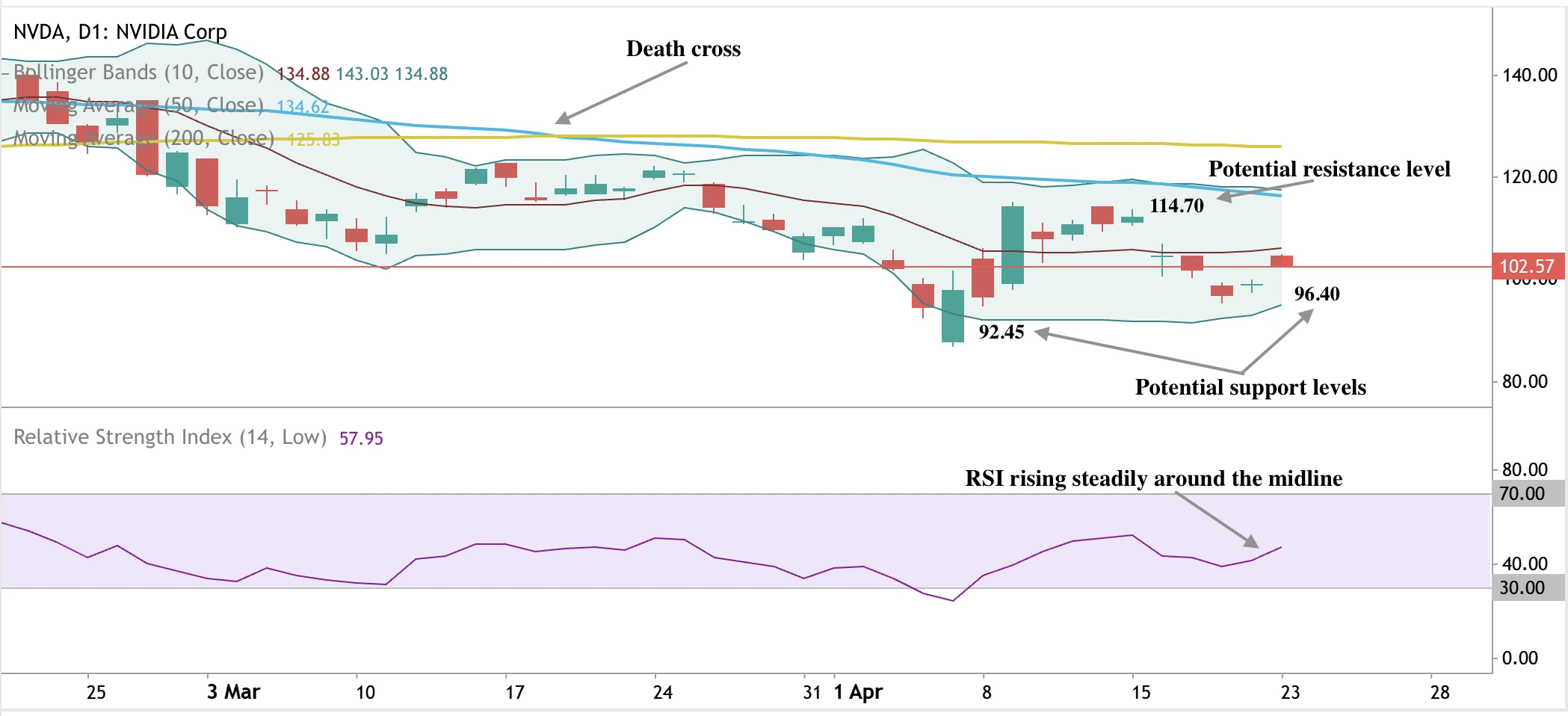 At the time of writing, Nvidia trades around the $102.57 mark, with beamish pressure apparent on the daily chart. A recent “death cross” where the 200 SMA crossed above the 50 SMA adds to the bearish narrative. However, the rising RSI around the midline hints at upward pressure building. Should we see a slide, prices could be held at the $96.40 and $92.45 support levels. Should we see a bounce, prices could encounter a resistance wall at the $114.70 price level.