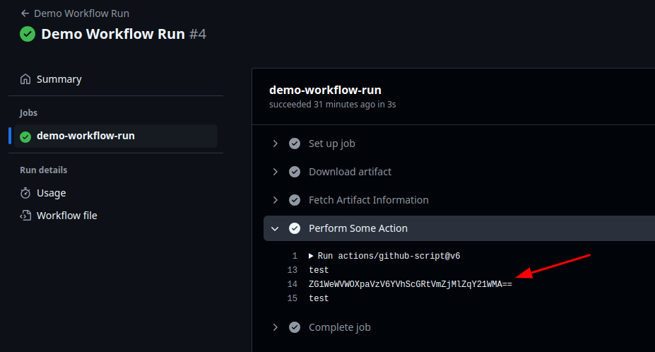 The workflow runs triggers, downloads the tampered artifact and processes it. As the artifact has been tampered with, code injection occurs in the workflow and the secret is leaked.