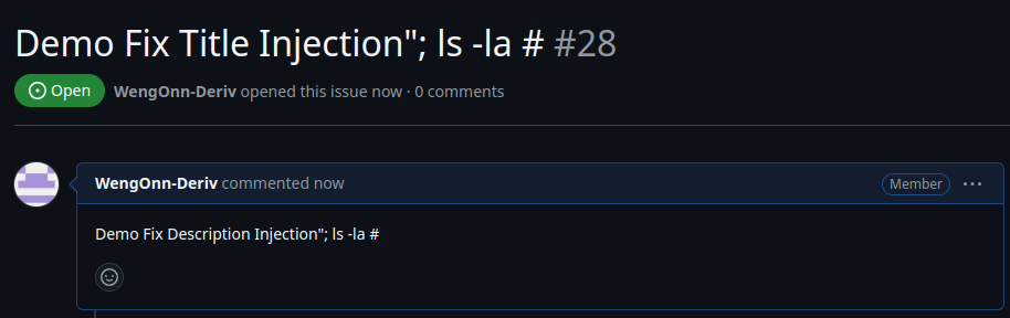 In this workflow, there are two command injection points, which are ${{github.event.issue.title}} and ${{github.event.issue.body}} as both of these contexts are being called under run. As user inputs are used unsanitised, it allows attackers to sneak in commands like ls -la (which can obviously be substituted with something much more malicious).