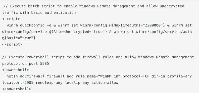 The last line in the above code sample triggers the required user data snippet, which enables and configures the Windows Remote Management (WinRM) connection using the bash command and adding and enabling the firewall rules using the PowerShell script. With the WinRM protocol enabled, we are able to remotely connect, via terminal, to the Windows instance.