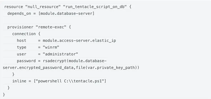 The next step was to manage Terraform integration with the Octopus Deploy Server to automate the transition. That's why we used null resources whose purpose was to execute a PowerShell script on the host.
