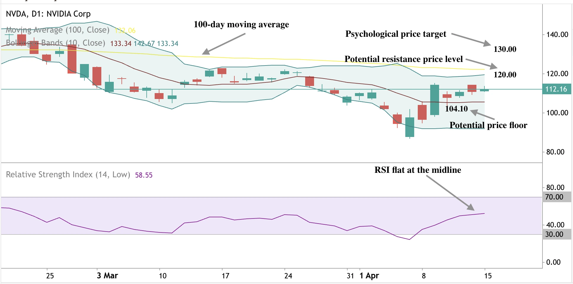 Akcje Nvidii oscylują w okolicach poziomu 112 dolarów, a dzienny wykres pokazuje oznaki odbicia. RSI utrzymujące się na linii środkowej sugeruje niską siłę ruchu, co wskazuje, że możemy spodziewać się konsolidacji. Ceny pozostające poniżej średniej kroczącej sugerują, że główny trend nadal jest spadkowy, chyba że pojawi się znaczny wzrost poniżej tej średniej.
