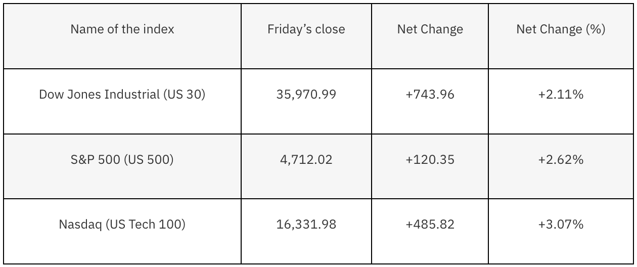 To był dobry tydzień dla indeksów US. Obawy związane z wariantem Omikron wydają się zmniejszać, ponieważ wstępne badania przeprowadzone przez BioNTech i Pfizer pokazują, że dawka przypominająca będzie skuteczna przeciwko wirusowi. S&P 500 i Nasdaq Composite odnotowały największy tygodniowy wzrost od lutego, podczas gdy Dow Jones zanotował swoje najlepsze tygodniowe zyski od marca. Akcje dużych spółek wzrostowych w USA przewyższyły akcje wartościowe, głównie napędzane przez akcje technologii informacyjnej, takie jak Apple (AAPL) i Cisco Systems Inc (CSCO).