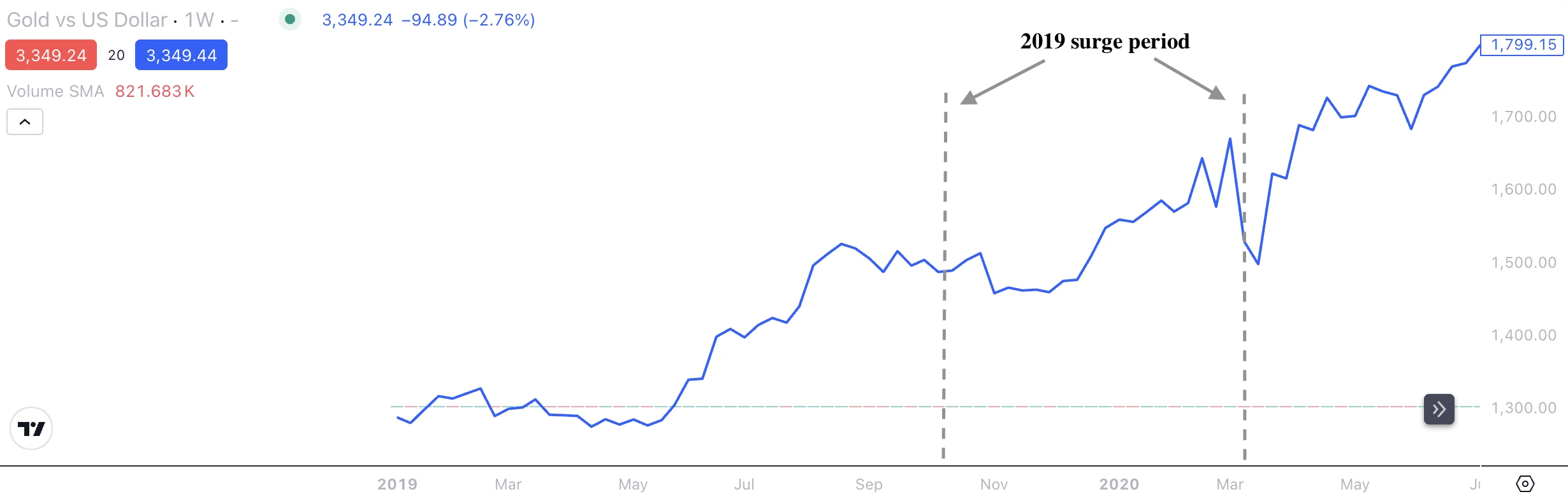Мы уже это видели. В период противостояния США и Ирана в 2019 году золото подросло на 10–15% всего за несколько дней.