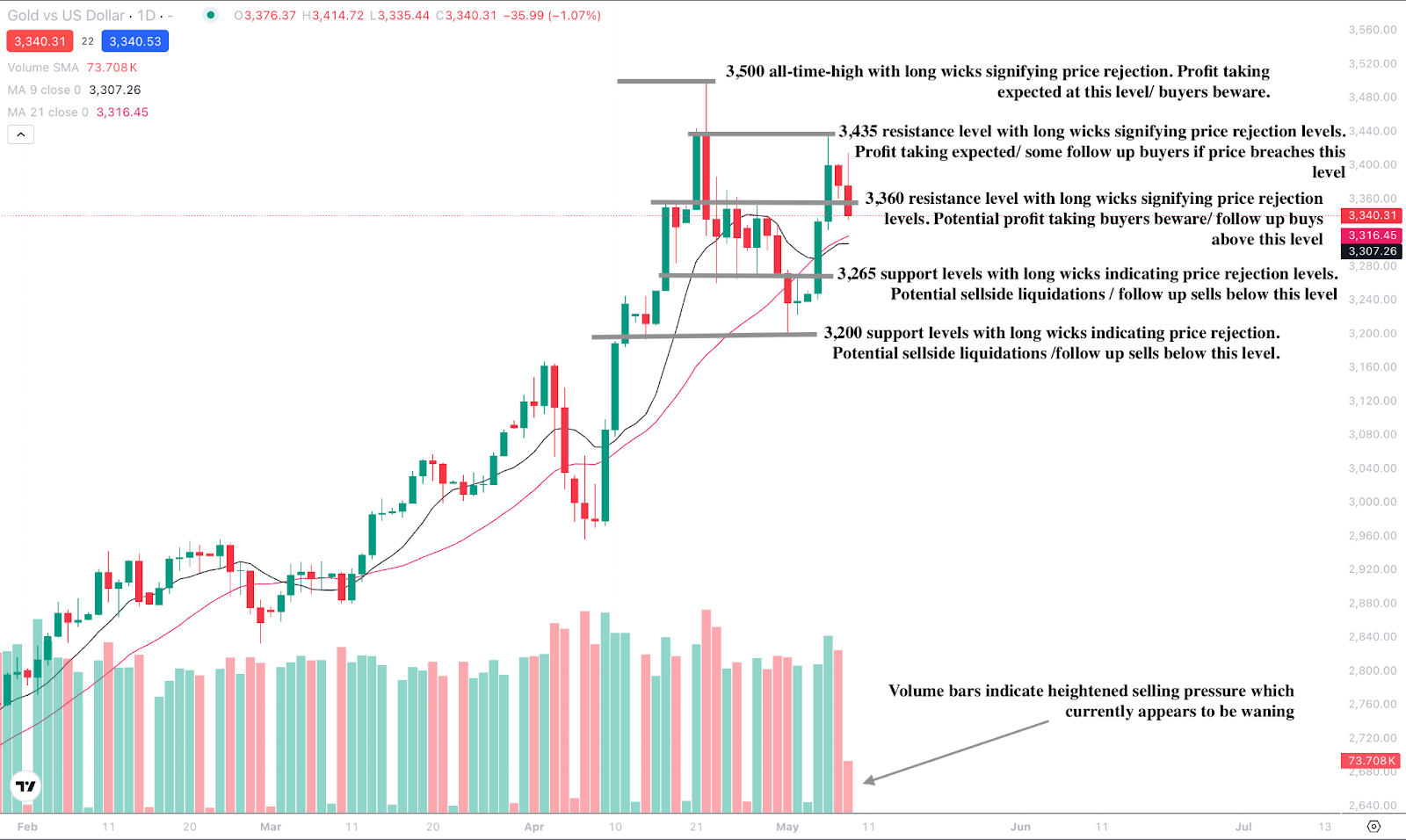 Gần đây, vàng thể hiện động lực mua mạnh trên biểu đồ hàng ngày, sau đó là động lực giảm mạnh. Các thanh khối lượng cho thấy áp lực bán tăng cao, nhưng có vẻ đang yếu dần. Nếu giá tiếp tục giảm, họ có thể tìm thấy hỗ trợ tại các mức 3.265 và 3.200 đô la. Nếu xuất hiện đà hồi phục, giá có thể gặp kháng cự tại các mức 3.360, 3.435 và 3.500 đô la.