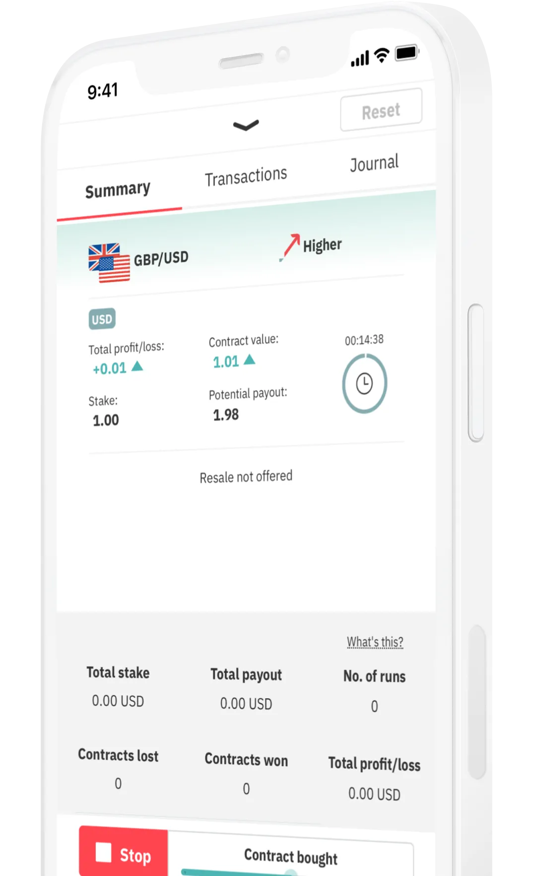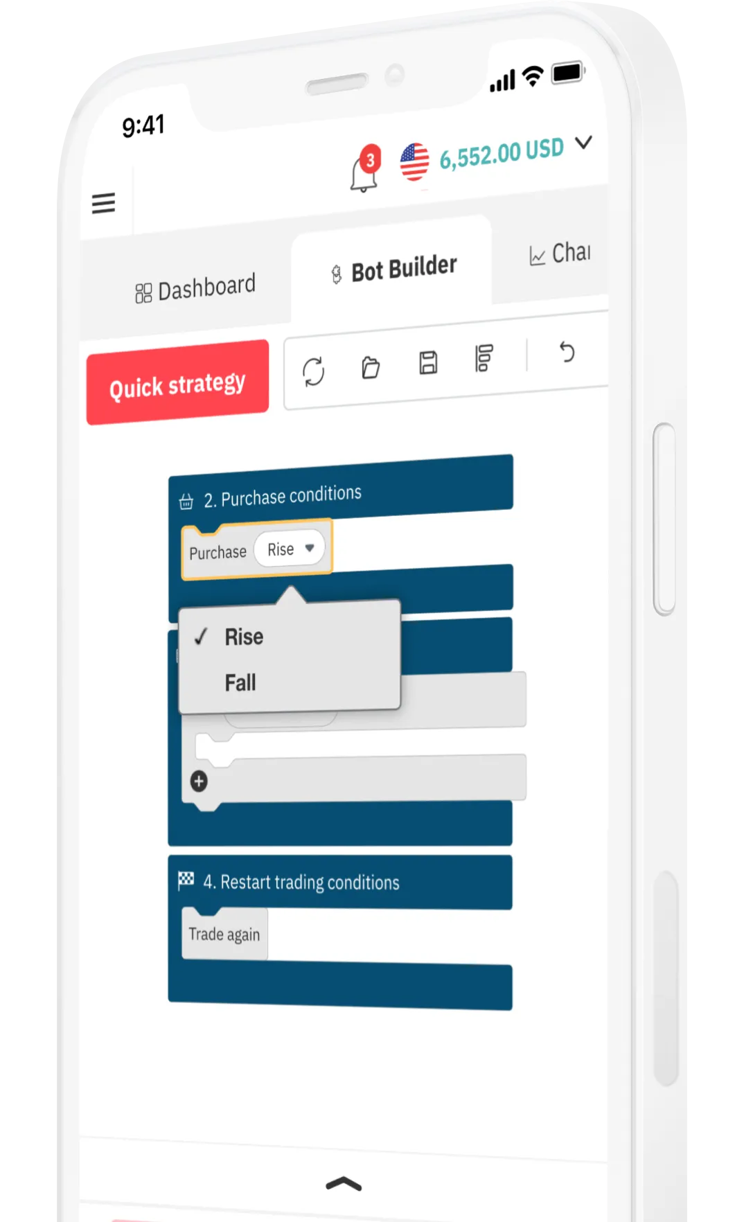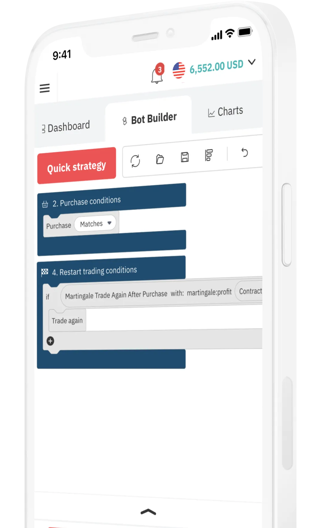 Automate your trades in Forex, Stock Indices, Commodities, and 24/7 Derived Indices. Import a bot, customise a preset strategy, or create your own with a simple drag-and-drop interface.